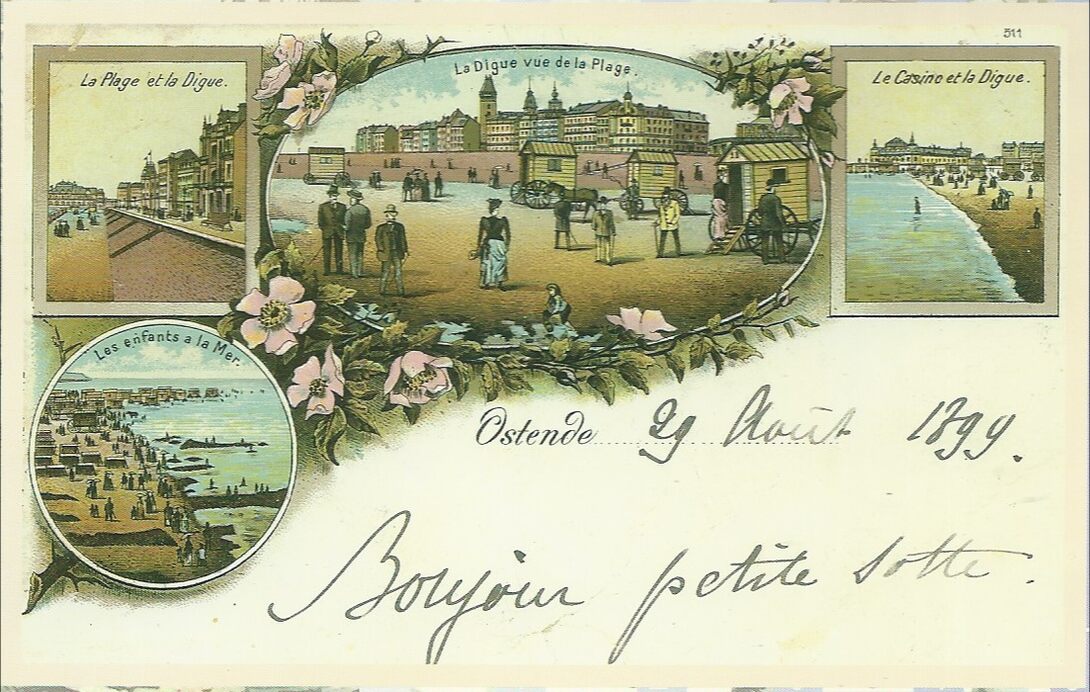 De nog niet volledige toegebouwde Zeedijk vanaf de Parijsstraat naar het Kursaal toe. Badkoetsen en strandwandelaars. Twee kleine zichtjes van het strandleven. (Omer Vilain)
