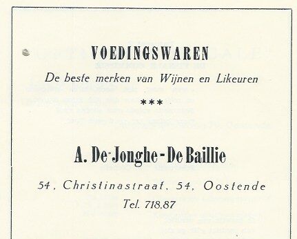 Advertentie : A. De Jonghe-De Baillie. Voedingswaren. Christinastraat 54, Oostende