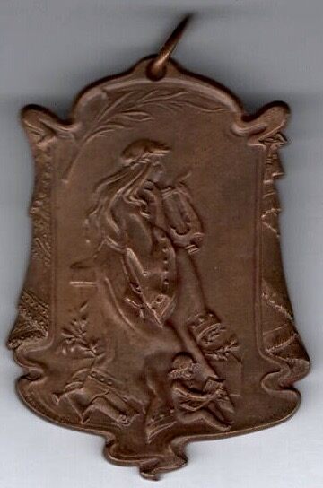 De penning heeft de vorm van een open toneelgordijn en is aan beide zijden als…