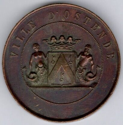 Op de voorzijde : rondom  boven VILLE D’OSTENDE, centraal in een parelcirkel het gekroonde wapenschild met keper en…