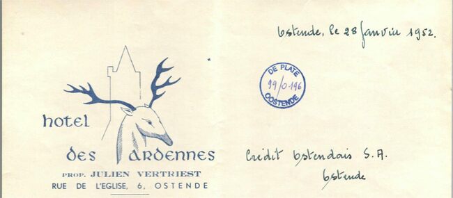 Hotel des ardennes,Rue de l'Eglise 6 Ostende. Prop. Julien Vertriest. dd 1952. gericht aan Credit Ostendais.