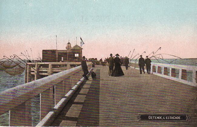 Ostende, l'Estacade. - Bijgekleurd. - Het Weststaketsel met op het einde het café-paviljoen. Je kon er genieten van een drankje en de gezonde zeelucht. Populair was ook, met een kruisnet een krabbetje of een visje te…