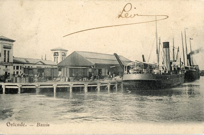 Ostende. Bassin. Tilbury schepen van de John Cockerill rederij tijdens het lossen of laden in de Visserskreek nabij de oude vismijn. Deze vrachtschepen onderhielden een regelmatige lijnvaart tussen Oostende en Tilbury.…