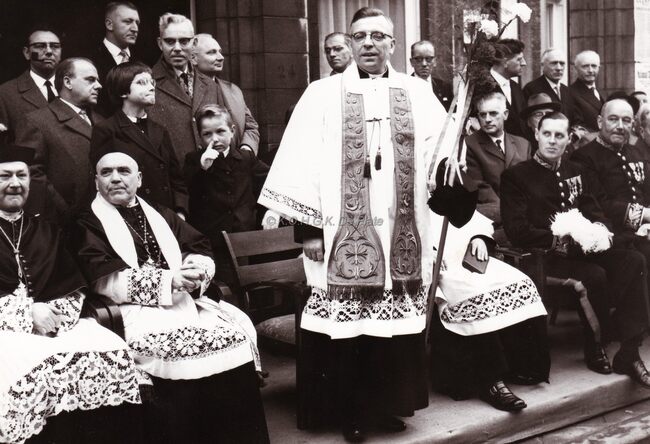 Pastoor PEEL wordt ingehaald in zijn nieuwe parochie Onze Lieve Vrouw te Mariakerke.Tweede van links deken René BUTAYE,rechts op de eerste rij Jan PIERS,Kamiel DEHOUCK,achter PIERS,Louis VANHOORNE. Rechtstaande achter de…