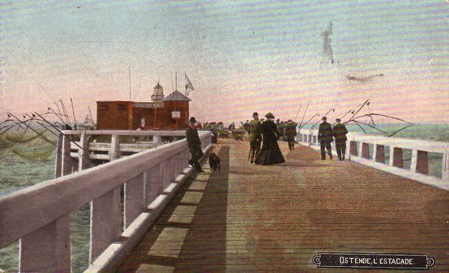 Ostende, L'Estacade. - Bijgekleurde kaart. Het Weststaketsel met op het einde het café-paviljoen, waar je kon genieten van een drankje en de gezonde zeelucht. Populair was ook, met een kruisnet een krabbetje of…
