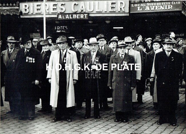 Foto : 13 x 18 cm - Defilé van militairen en oudstrijders - Groepsfoto oudstrijders - Markt Brussel?