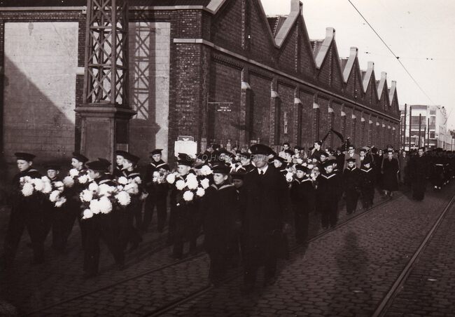 De begrafenisstoet van Ernest Van Glabbeke op de Nieuwpoortsesteenweg ter hoogte van de Stuiverstraat. De Ibisjongens dragen bloemen. Links het tramdepot met een telefoonmast.