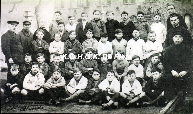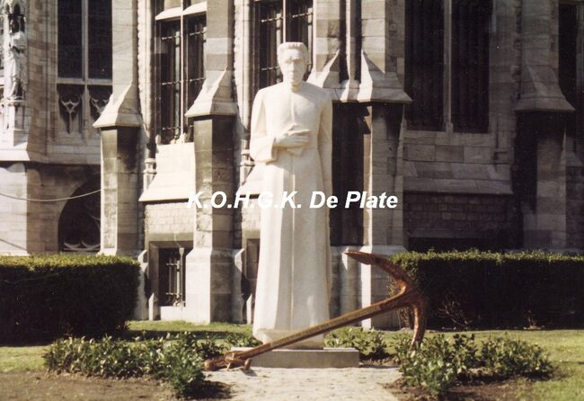 Foto : 15 x 10. Ex invent 35/96l. Standbeeld in witte natuursteen op vierkante sokkel met aan de voet van het beeld een scheepsanker. Het staat in de plantsoenen van de Sint Petrus- en Pauluskerk, kant Jozef II-straat.…