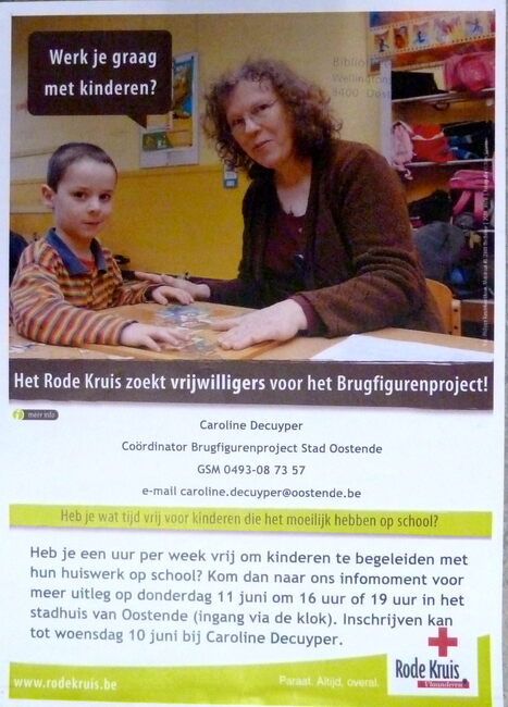 Affiche : Rode Kruis Vlaanderen. Het Rode Kruis zoekt vrijwilligers voor het Brugfigurenproject !. Stadhuis. 11 juni