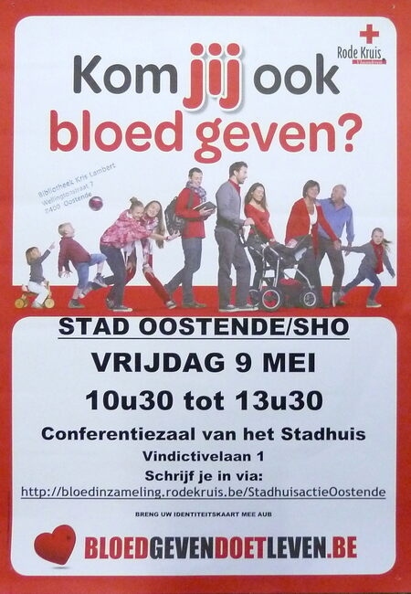 Affiche : Rode Kruis Vlaanderen. Kom jij ook bloed geven ?. Conferentiezaal van het Stadhuis. 9 mei