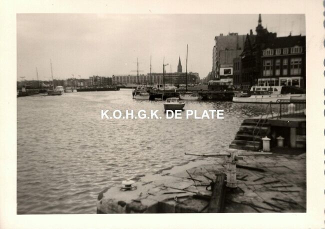 Formaat : 9 x 11,5 cm. - Rechts een deel van de Vindictivelaan en in de achtergrond het stadhuis en de kerktoren van de Sint Jozefskerk. Vooraan, het eerste handelsdok en de ingang naar de sluis