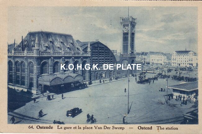 Albert, N° 64. - Ostende - La gare et la place Van Der Sweep. Ostend - The station. - De wijk Hazegras. Het spoorwegstation was gelegen langs de Vandersweepplaats. Rechts zien we nog een gedeelte van het tramwachthuisje…