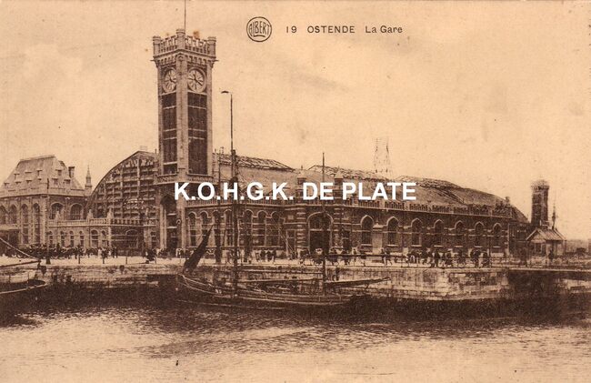 Albert, N° 19. - Ostende - La Gare. - Het spoorwegstation gezien vanaf het eerste handelsdok. Het was gelegen langs de Vandersweepsplaats op de wijk Hazegras. Gemeerd, de Nieuwpoortse visserssloep N5