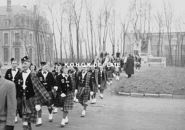 Negatief : 4 x 6,5 cm. - Inhuldiging van het vaandel van de whistmaatschappij "Ostendia" in het dienstdoend stadhuis (gerechtshof). Na de plechtigheid volgde een optocht door de stad en werden bloemen gelegd aan…