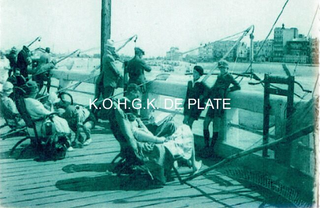 Afdruk. - Formaat : 14 x 9.5cm. - Genieten van de gezonde zeelucht op het einde van het Weststaketsel, waar je met een kruisnet kon proberen een krabbetje of visje te vangen. Op de achtergrond zien we het Klein Strand,…