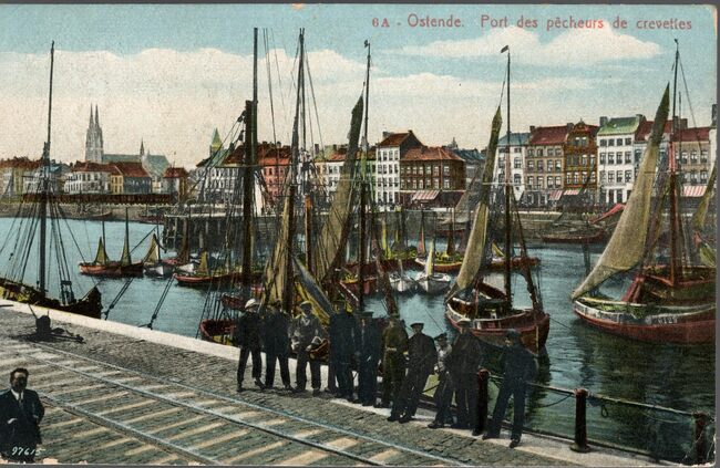 Marco, 6 A. - Ostende - Port des pêcheurs de crevettes. - Bijgekleurde kaart. - Vissers poseren waar nu de Sir Winston Churchillkaai is. Vooraan, de treinsporen die leiden naar de Oude Vismijn (de Cirk), waar de…
