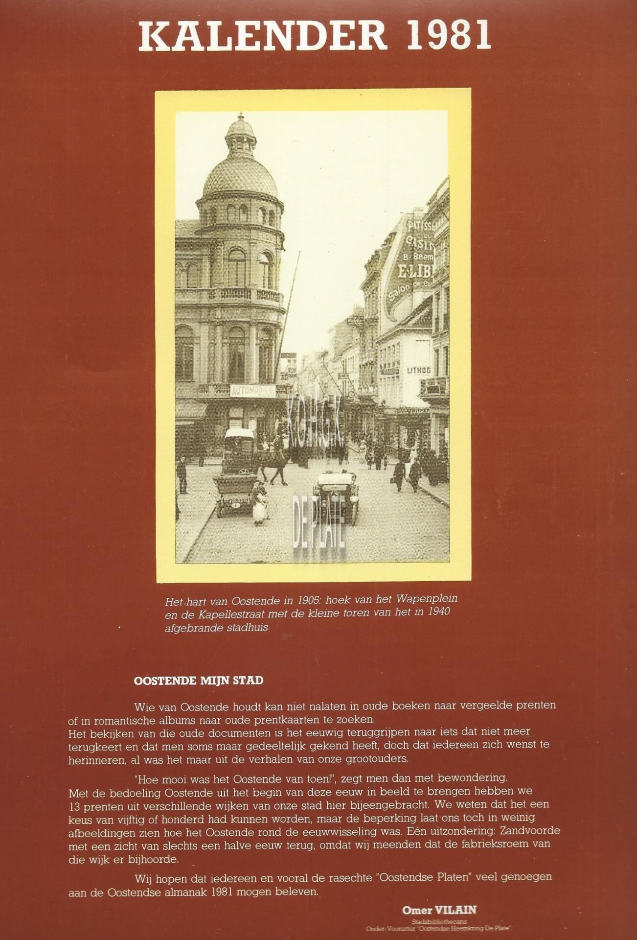 Kalender geschonken aan de leden van de Oostendse Heemkundige Kring "De Plate", vzw door "Sneldruk Center Oostende". Samengesteld door Omer Vilain. - De illustraties bij de kalender worden afzonderlijk beschreven. Klik op het inventarisnummer.