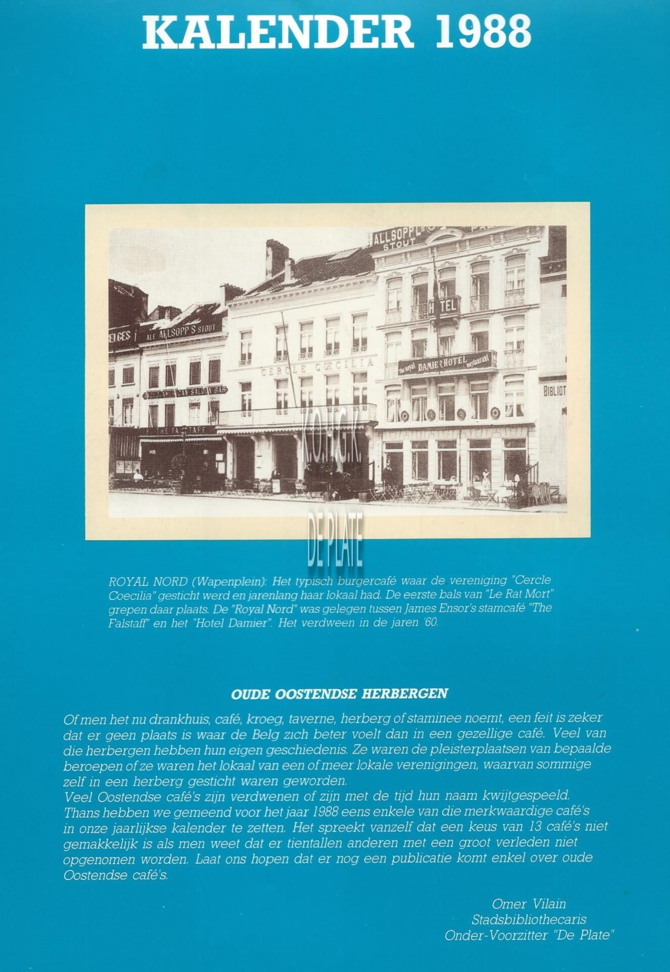 Kalender geschonken aan de leden van de Oostendse Heemkundige Kring "De Plate", vzw door "Grafisch Bedrijf Lammaing" (Sneldruk-Center-Oostende). Samengesteld door Omer Vilain. - De illustraties bij de kalender worden afzonderlijk beschreven. Klik op het inventarisnummer.