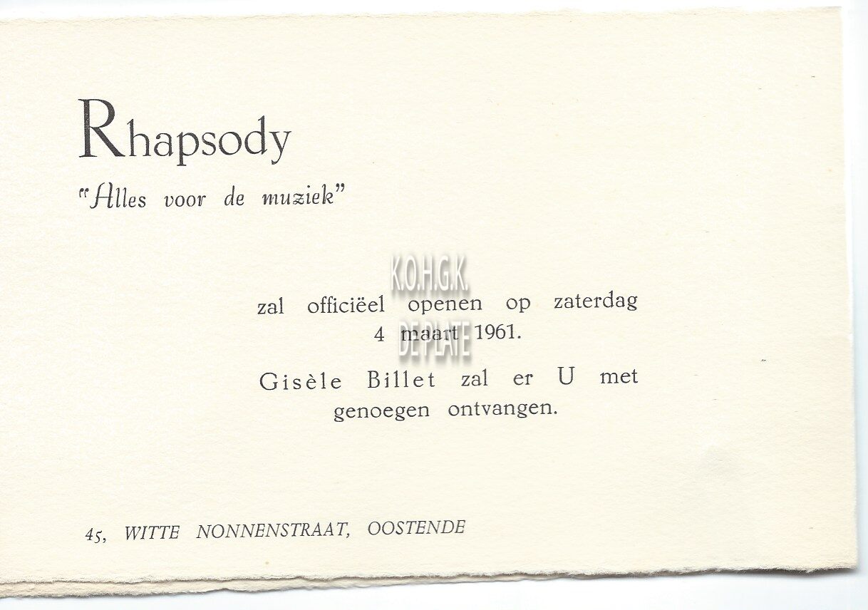 Omschrijving Officiële opening op zaterdag 4 maart 1961. Zaakvoerster : Gisèle Billet Trefwoorden KLEIN DRUKWERK RHAPSODY (MUZIEKHANDEL) BILLET GISÈLE (HANDELAARSTER) WITTENONNENSTRAAT Plaatskenmerk ARCHIEF 110 ARCHIEFDOOS HANDEL Inventarisnummers 2014/2325 04/ 03/ 1961 Print