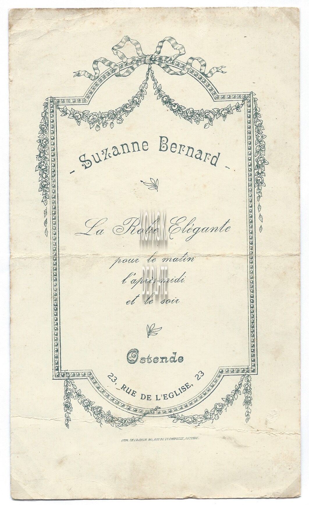 Trefwoorden KLEIN DRUKWERK BERNARD SUZANNE (DAMESKLEDING) HANDEL ; KLEDING KERKSTRAAT Plaatskenmerk ARCHIEF 110 ARCHIEFDOOS HANDEL Inventarisnummers 2023/0307 Herkomst HEEMKRING TER CUERE Vervaardiger Lith. De la Cour Print