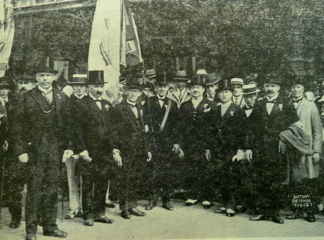 Foto : Leden van de Oostendse vereniging "La Wallonie" poseren met hun vlag naar aanleiding van hun 25-jarig bestaan. (Foto Antony 1928)