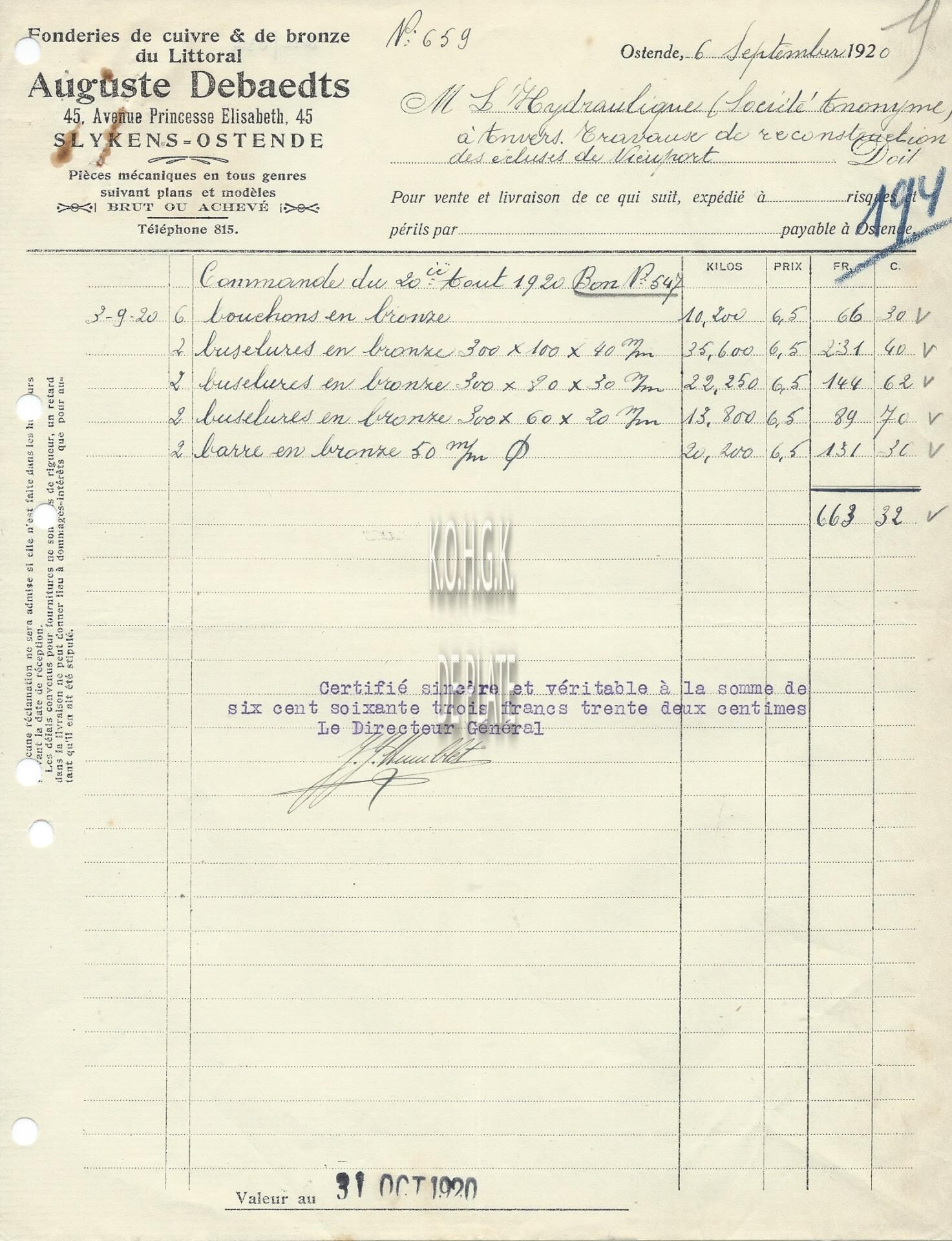 Leveringsbon : Auguste Debaedts. Koper- en Bronsgieterij. Prinses Elisabethlaan 45, Bredene