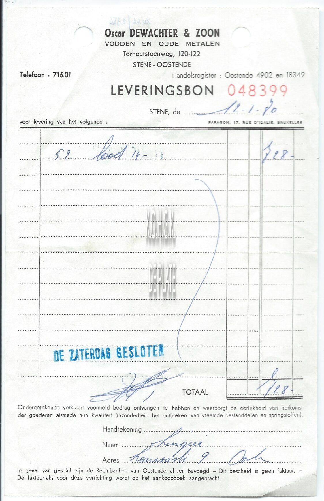 Leveringsbon : Oscar Dewachter & Zoon. Vodden en oude metalen. Torhoutsesteenweg 120-122, Stene
