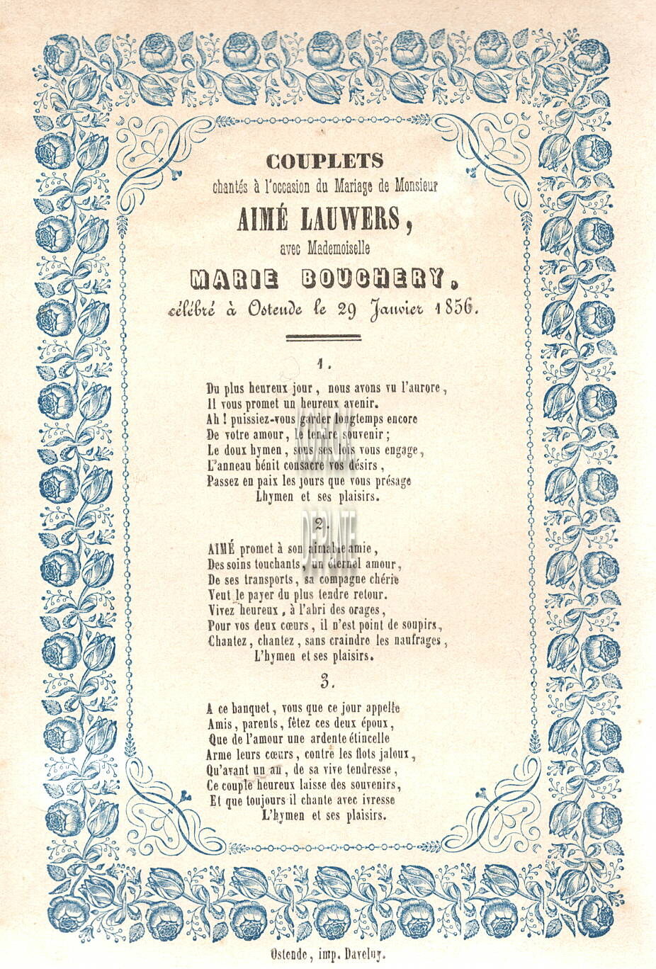 Formaat : 18 x 12 cm. - Couplets chnté à l'occasion du mariage de monsieur Aimé Lauwers avec Mademoiselle Marie Bouchery célébré à Ostende le 29 janvier 1856