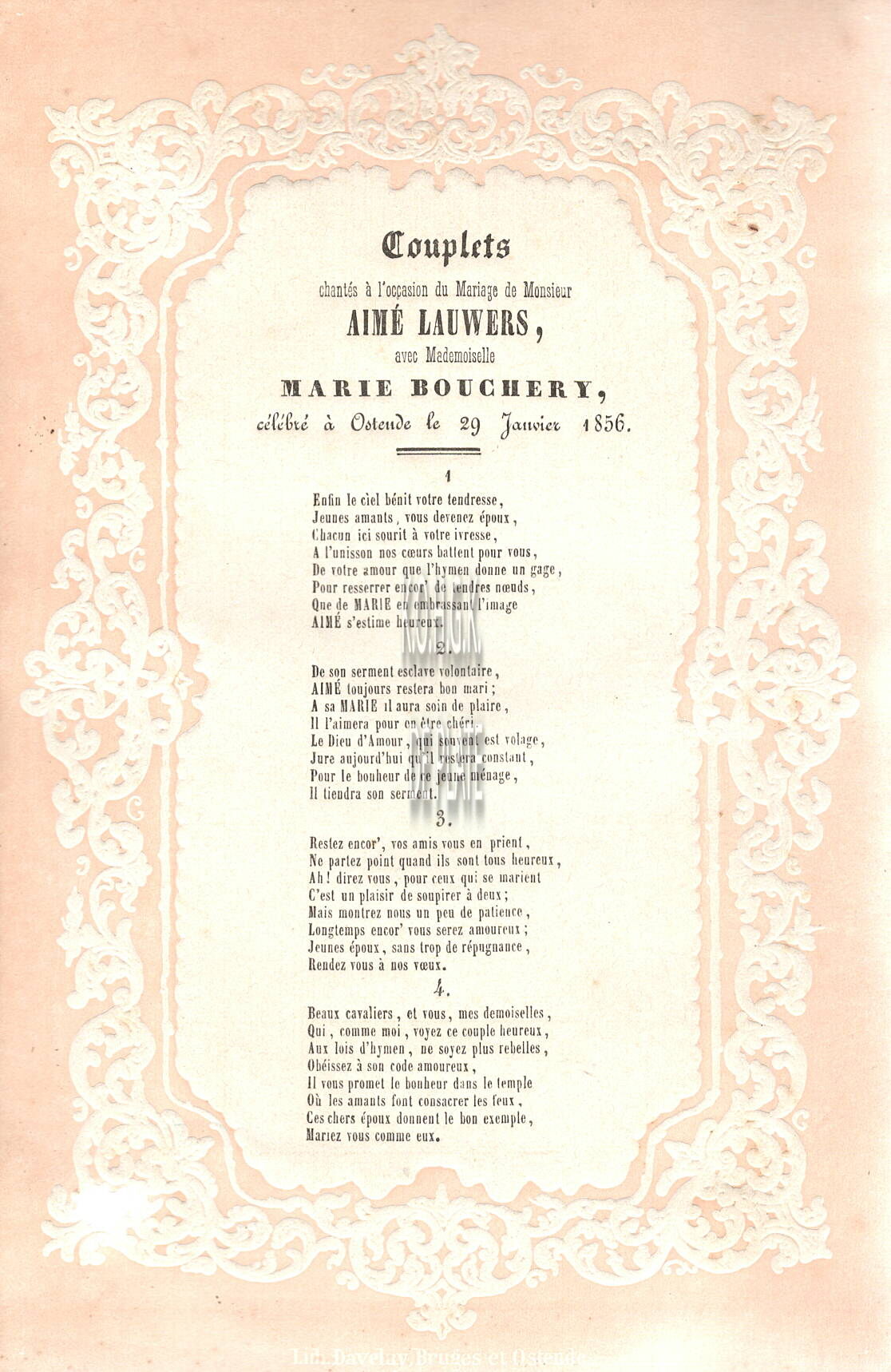Formaat : 22 x 14,5 cm. - Couplets chnté à l'occasion du mariage de monsieur Aimé Lauwers avec Mademoiselle Marie Bouchery célébré à Ostende le 29 janvier 1856