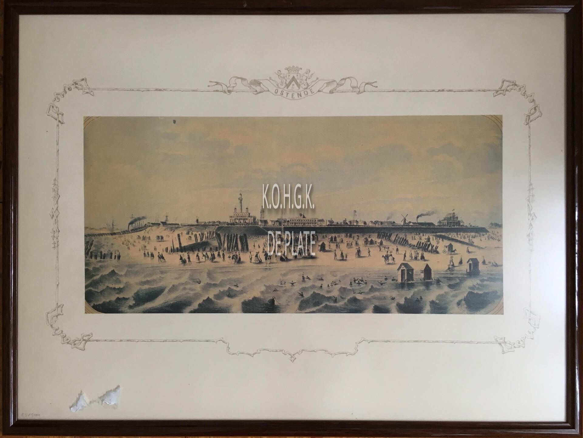 Ingekaderde reproductie van een gekleurde houtsnede met zicht op het strand, de stadsmuren en o.a de Cercle du Phare en het Pavillon Royal