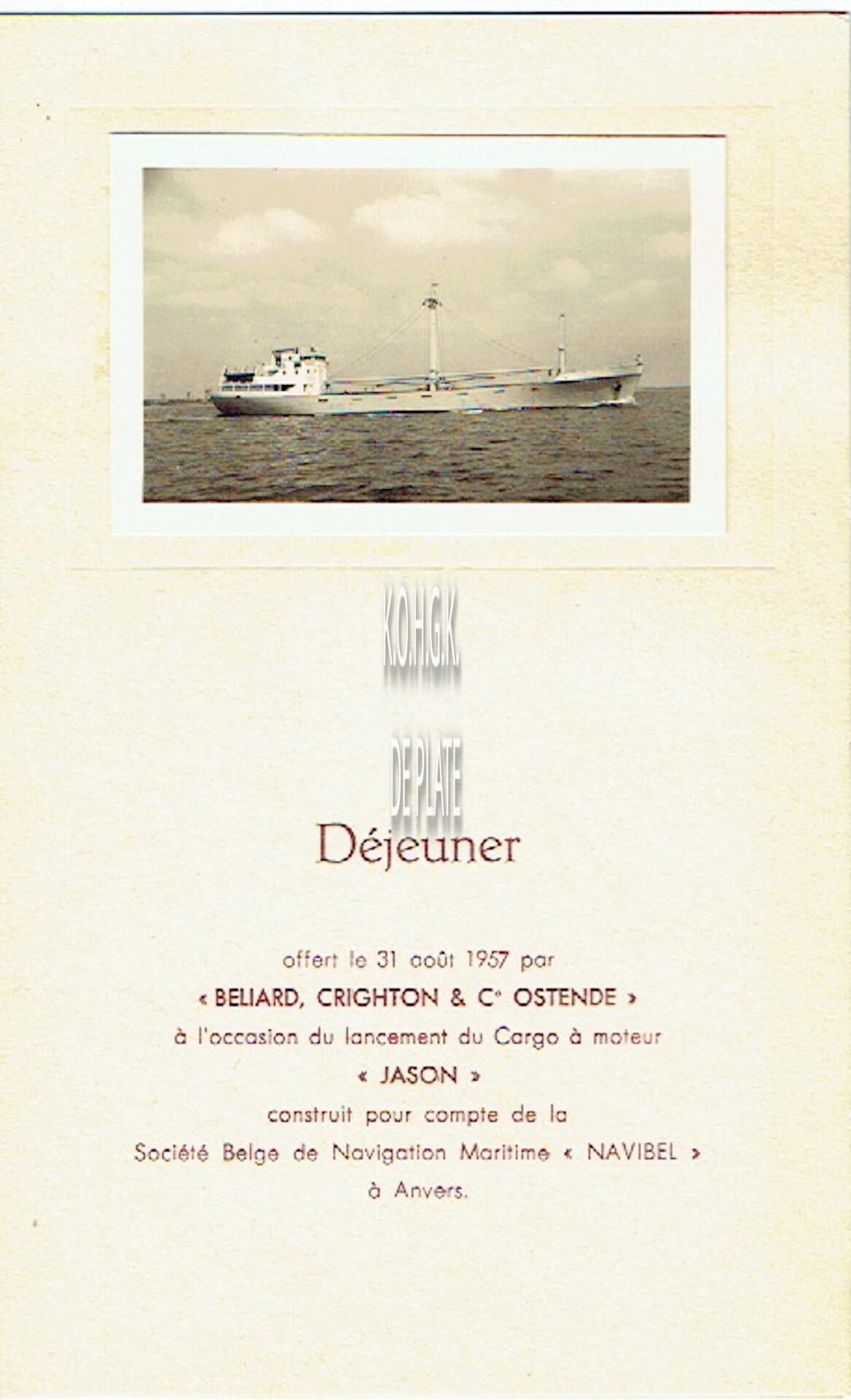 Déjeuner offert le 31 août 1957 par "Belliard, Crighton & C° Ostende" à l'occasion du lancement du Cargo à moteur "Jason" construit pour compte de la Société Belge de Navigation Maritime "Navibel" à Anvers