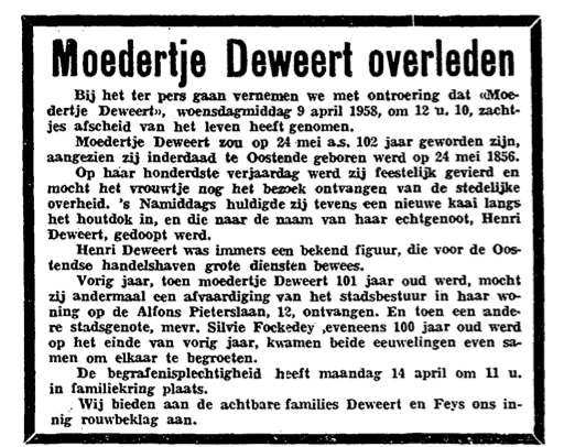 Trefwoorden DESMET MATHILDE (1856-1958) (WEDUWE HENRI DEWEERT) HONDERDJARIGEN Plaatskenmerk O.D.P.-archieven. Bibliotheek Kris Lambert 09-04-1958 Bron Het Kustblad Pagina's 2 Print