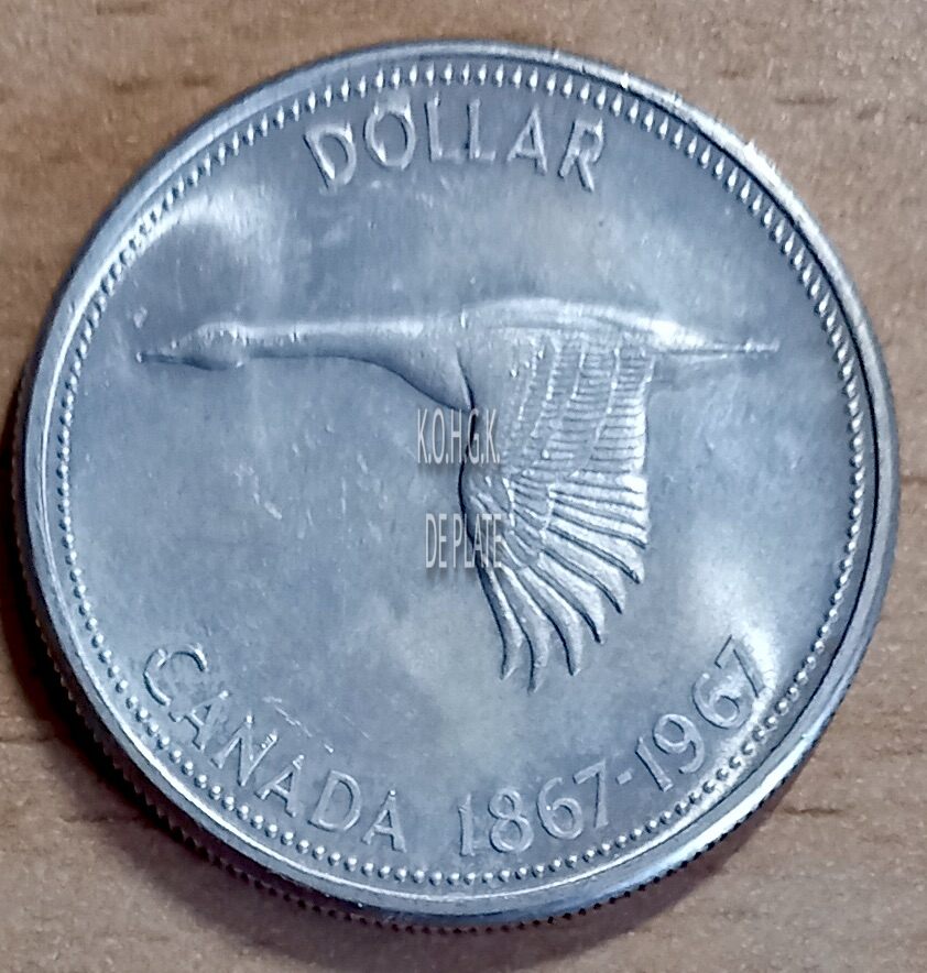 Op de keerzijde : rondom een parelrand, rondom boven 1 DOLLAR, centraal een Canadese gans, rondom onder CANADA 1867-1967
