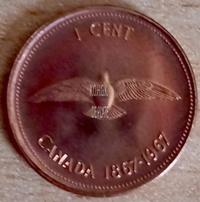 Op de keerzijde : rondom een parelrand, rondom boven1 CENT, centraal een duif, rondom onder CANADA 1867-1967