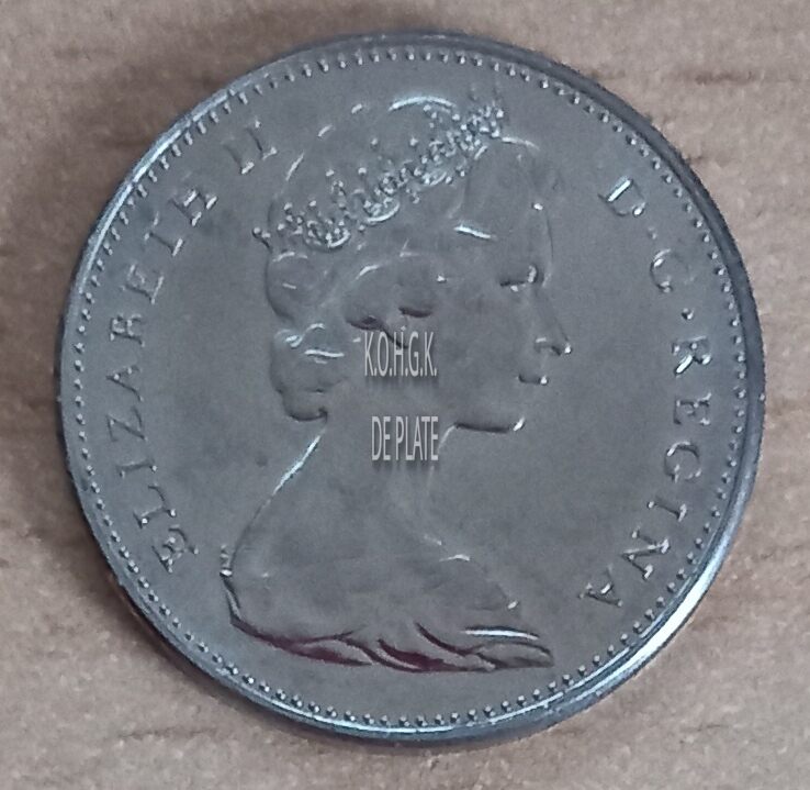 Op de voorzijde : rondom een parelrand, rondom link ELIZABETH II, rondom rechts D. G. REGINA, centraal de buste van koningin Elizabeth II met gekroond hoofd naar rechts gericht.