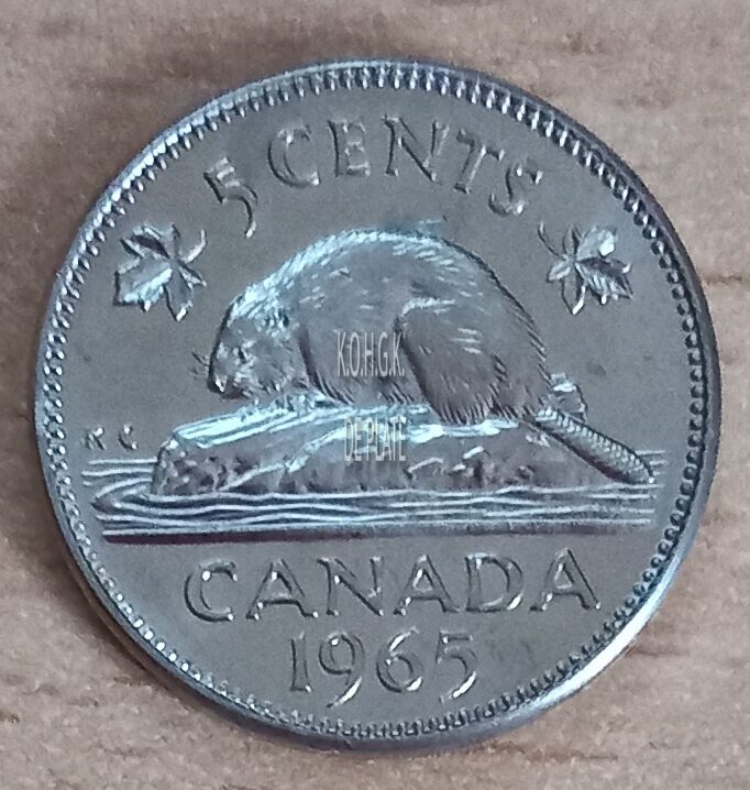 Op de keerzijde : rondom een parelrand, rondom boven 5 CENT met aan weerszijden een esdoornblad, centraal een Noord-Amerikaanse bever, onder de afbeelding CANADA / 1965