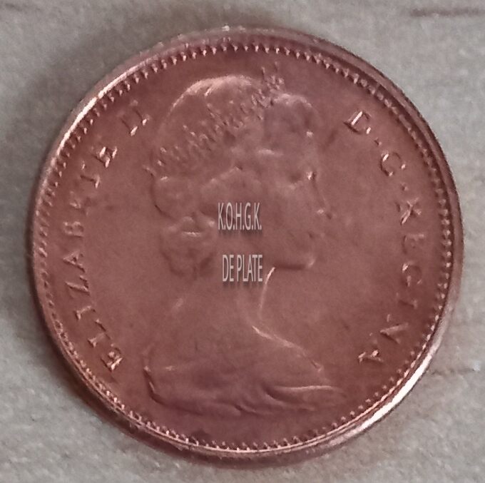 Op de voorzijde : rondom een parelrand, rondom link ELIZABETH II, rondom rechts D. G. REGINA, centraal de buste van koningin Elizabeth II met gekroond hoofd naar rechts gericht.