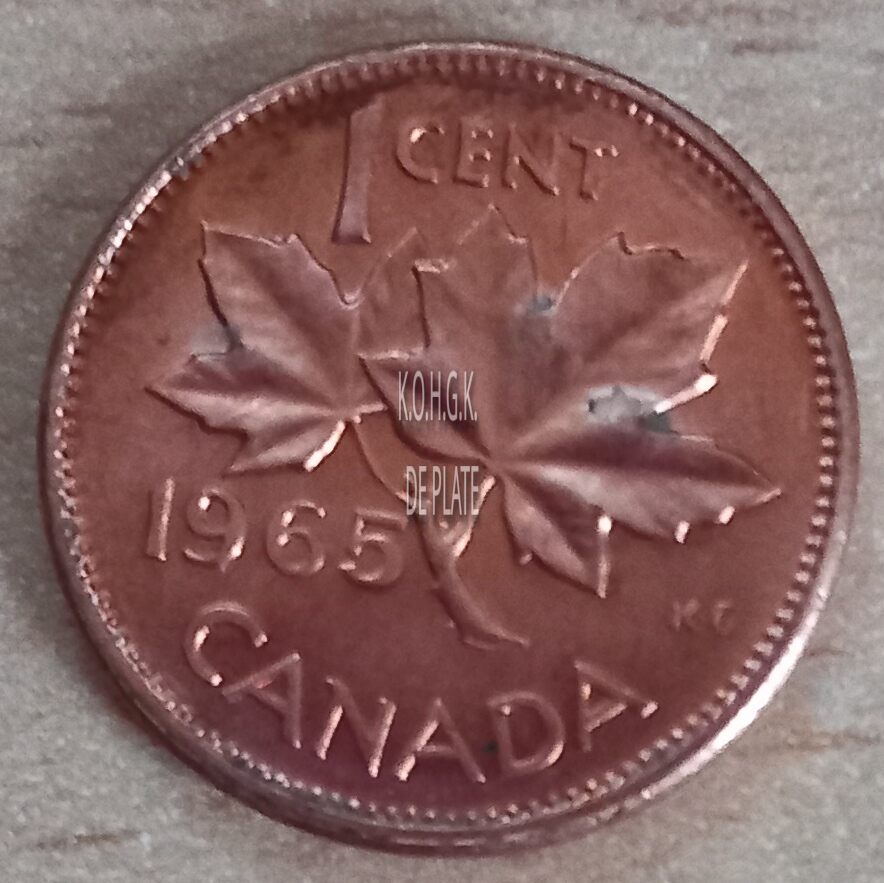 Op de keerzijde : rondom een parelrand, rondom boven 1 CENT, links horizontaal 1965, centraal een esdoorntak, rondom onder CANADA 1965, rechts horizontaal gesigneerd K.G.