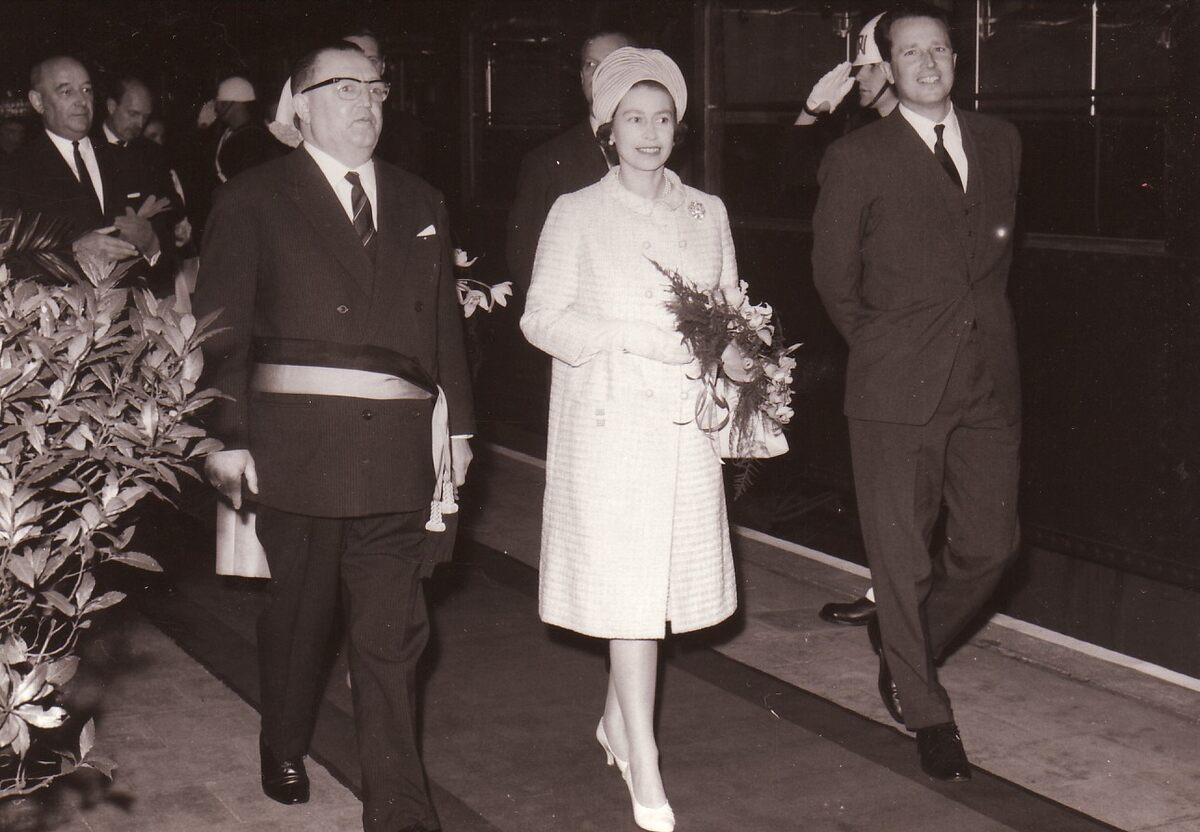 Een blijde Elizabeth II, koningin van het Verenigd Koninkrijk met koning Boudewijn en John Lauwereins, waarnemend burgemeester tijdens haar bezoek aan de stad. Zij kwam samen met haar echtgenoot Prins Philip, hertog van Edinburgh vanuit Brugge aan in het zeestation.