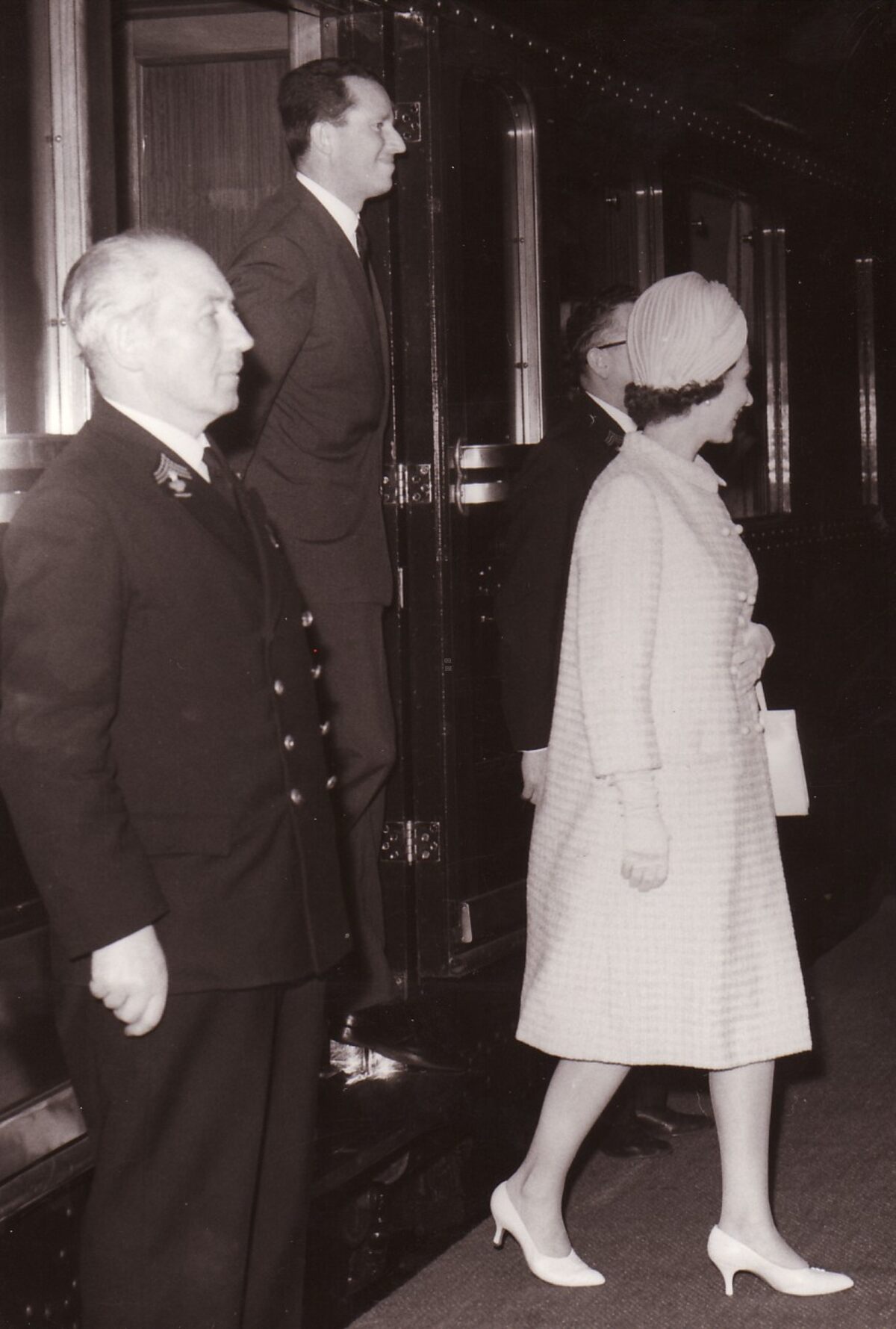 Aankomst van Elizabeth II, koningin van het Verenigd Koninkrijk in het zeestation. Achter haar koning Boudewijn. Zij had samen met haar echtgenoot, koning Boudewijn en koningin Fabiola Brugge bezocht.