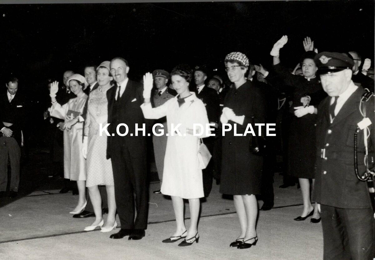 Formaat : 11 x 16,5 cm. Elizabeth II, koningin van het Verenigd Koninkrijk en prins Philip, hertog van Edinburgh vertrekken van op de Oostendse luchthaven. Koning Boudewijn en koningin Fabiola wuiven hen uit. Zij brachten een kort bezoek aan onze stad.