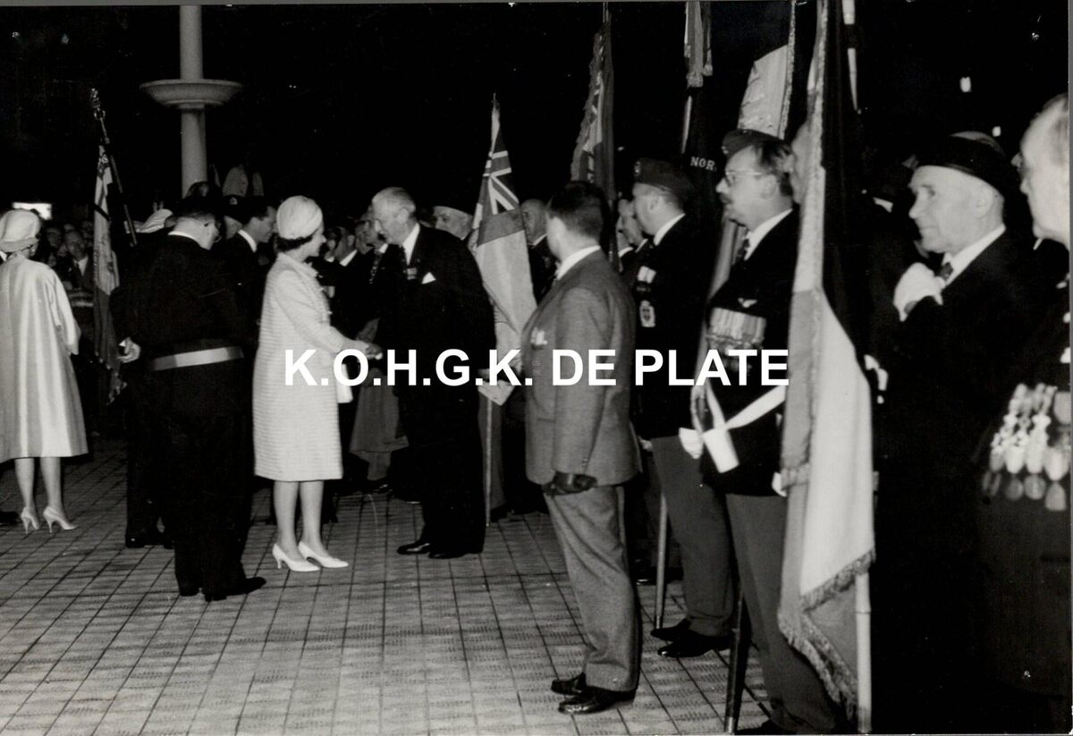 Formaat : 11 x 16,5 cm. De koningin begroet de vaderlandslievende verenigingen met hun vlaggen. Hier op het Zeeheldenplein nabij het Monument der Zeelieden.