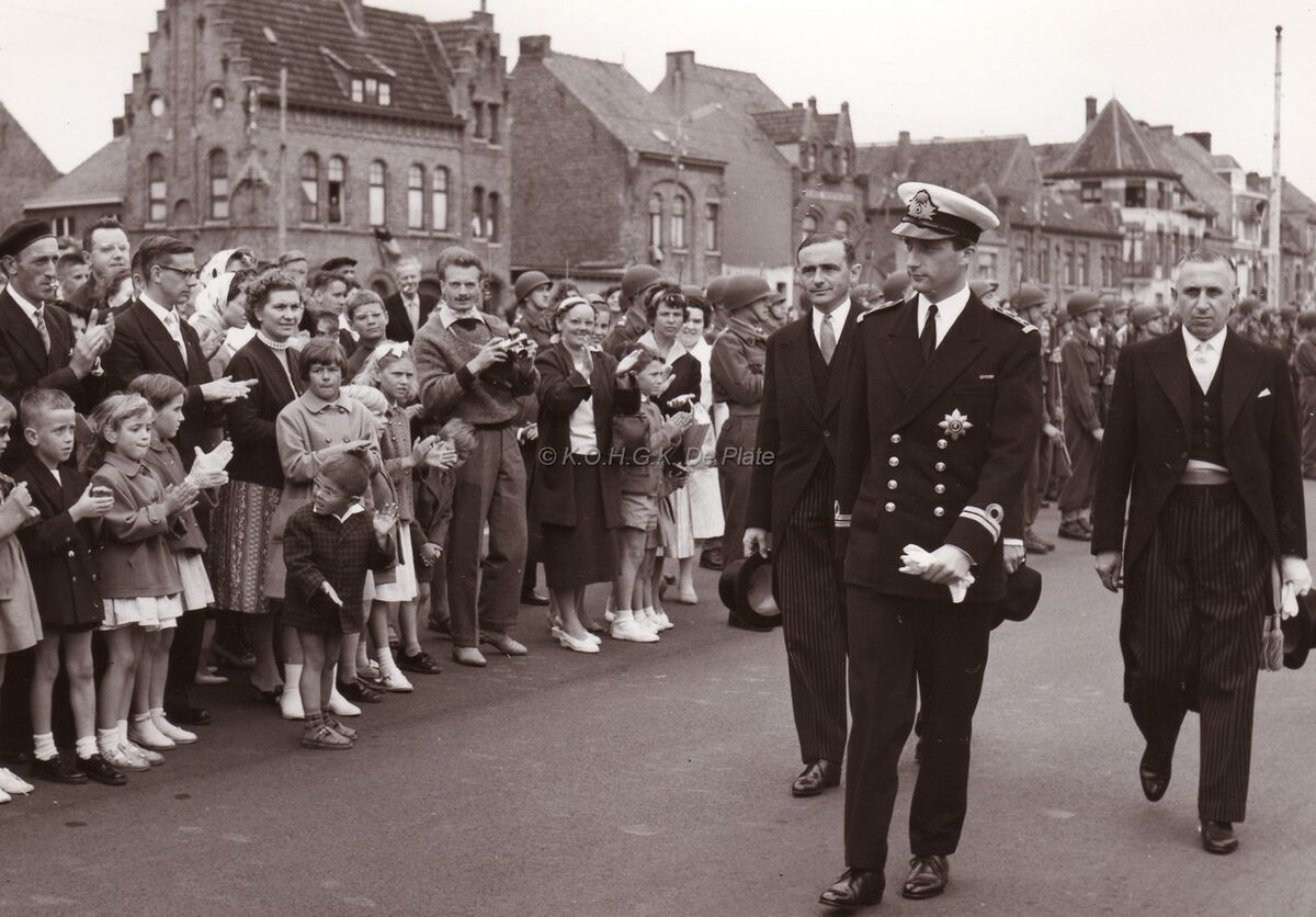 Prins Albert in gezelschap van o.a. : de gouverneur van de provincie West-Vlaanderen, Pierre Van Outryve d'Ydewalle (links) en Floribert Gheeraert, burgemeester van Nieuwpoort