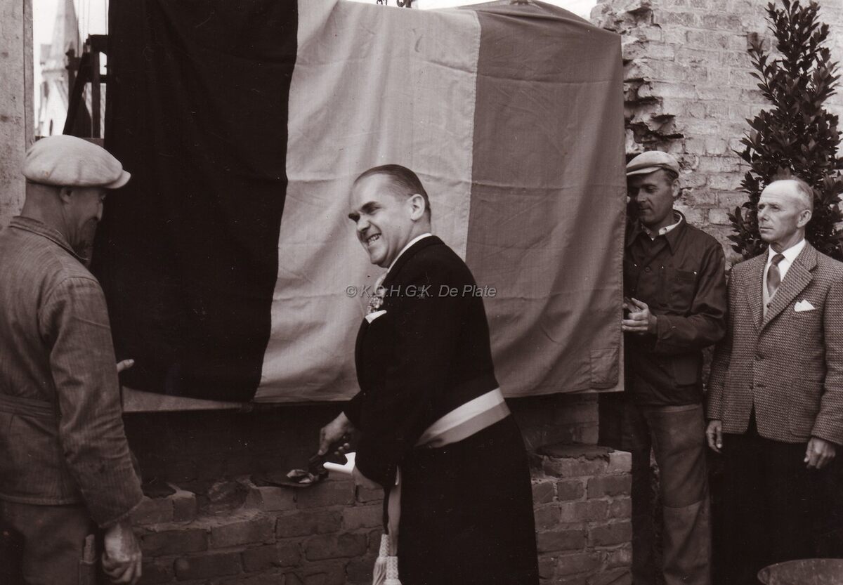 Formaat : 13 x 18 cm. - Burgemeester Adolf Van Glabbeke hanteert het truweel bij het plaatsen van de herdenkingssteen van het nieuwe slachthuis aan de Slachthuiskaai. Dit is ondertussen ook al geruime tijd op zijn beurt afgebroken (2012).