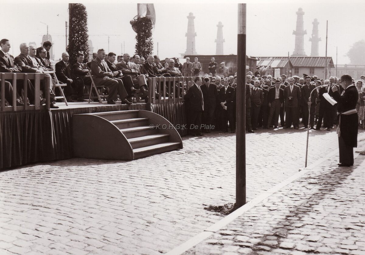 Formaat : 13 x 18 cm. - Speech van burgemeester Adolf Van Glabbeke bij het plaatsen van de herdenkignssteen van het nieuwe slachthuis (intussen ook al afgebroken) aan de Slachthuiskaai. Op de tribune de schepenen Jan Piers en naast hem Emiel Vroome