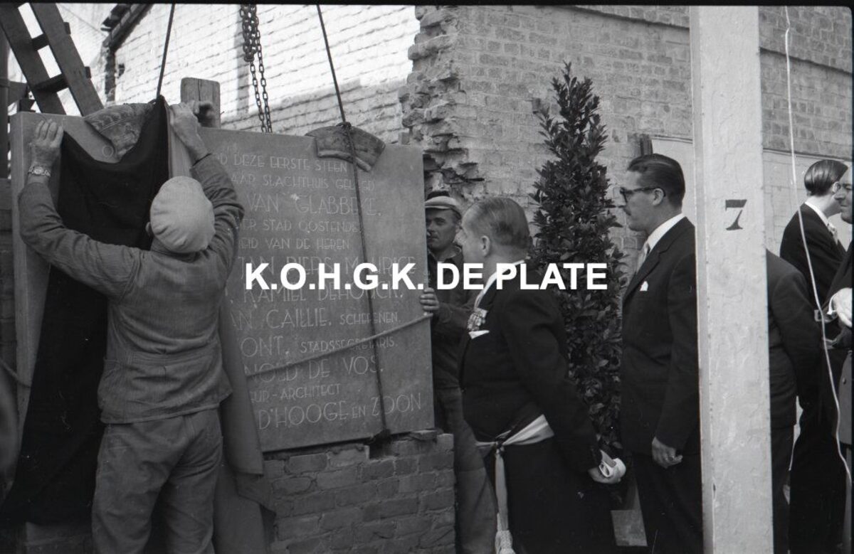 Negatief : 6 x 9 cm. - Plaatsen van de herdenkingssteen van het nieuw slachthuis. Burgemeester Adolf Van Glabbeke kijkt toe.