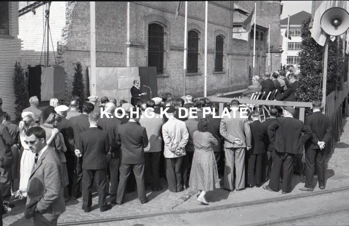 Negatief : 6 x 9 cm. - Burgemeester Van Glabbeke houdt zijn toespraak bij het plaatsen van de herdeningssteen van het nieuwe slachthuis. Het oude slachthuis is nog niet volledig afgebroken.