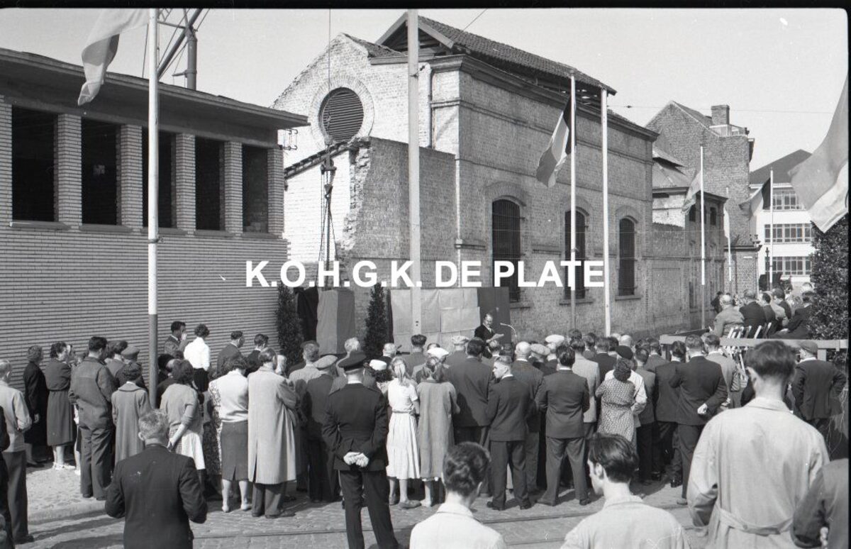 Negatief : 6 x 9 cm. - Burgemeester Van Glabbeke houdt zijn toespraak bij het plaatsen van de herdenkingssteen van het nieuw slachthuis. Het oud slachthuis is nog niet volledig afgebroken.