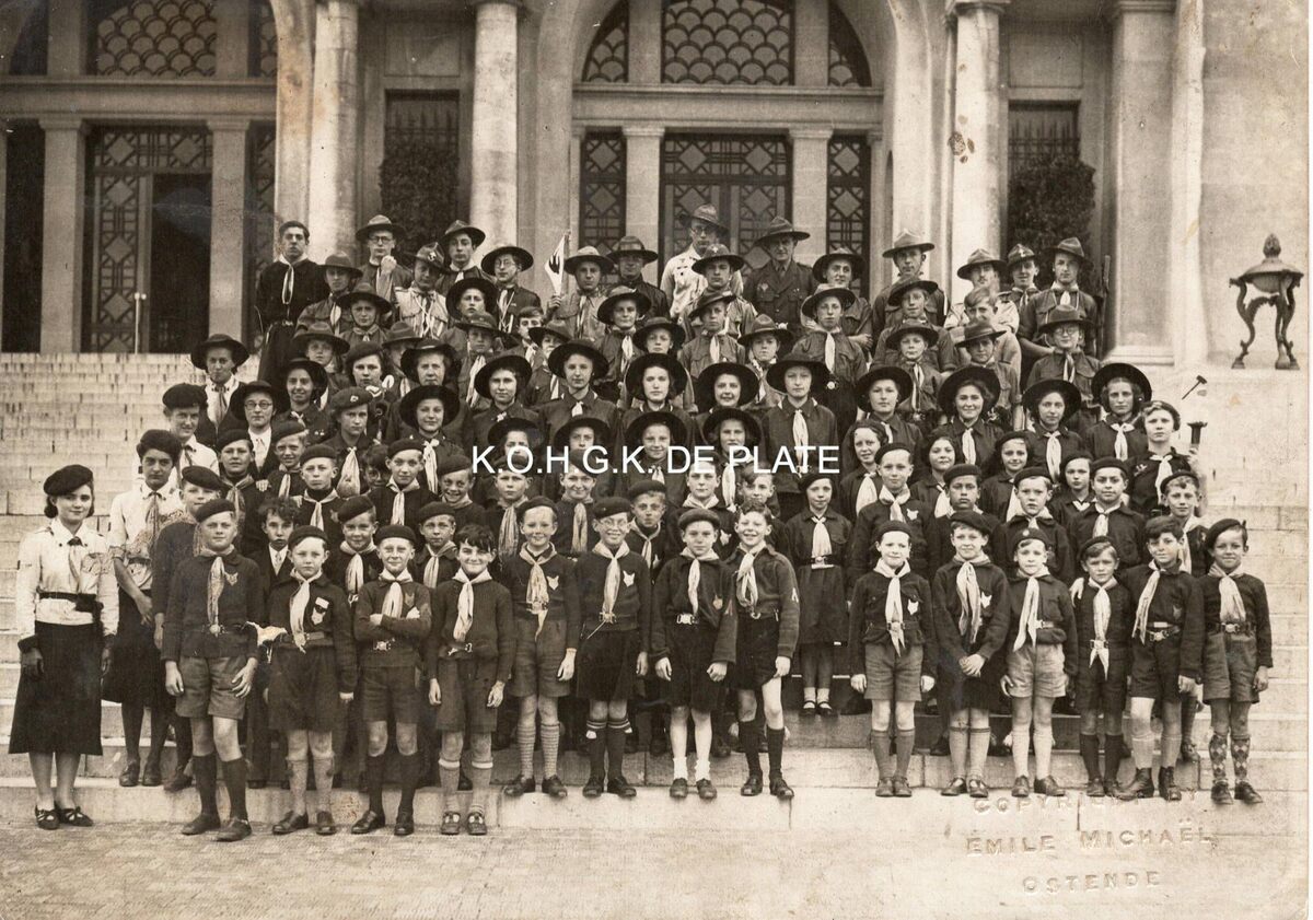 Formaat: 13 x 18 cm. - Groepsfoto van leden van de 1e gemengde groep van de scoutsbeweging op de trappen van het Thermae palace