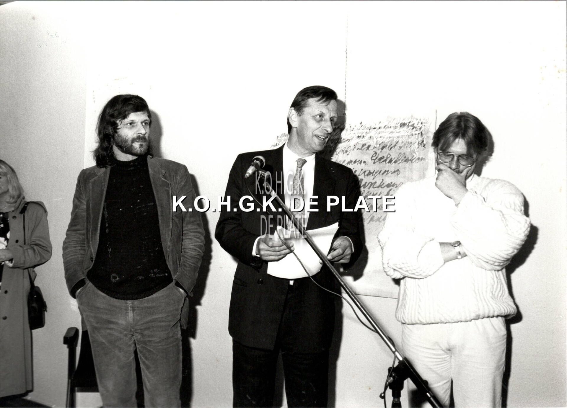 Formaat : 13 x 18 cm. -Vernissage tentoonstelling Flor Vandekerckhove in de Gallerie De Peperbusse, Prins Boudewijnstraat 7. Ingeleid door Hugo Brutin. Rechts André Baert